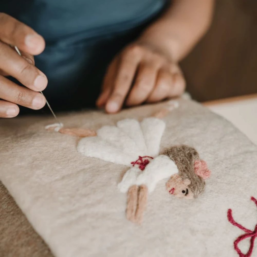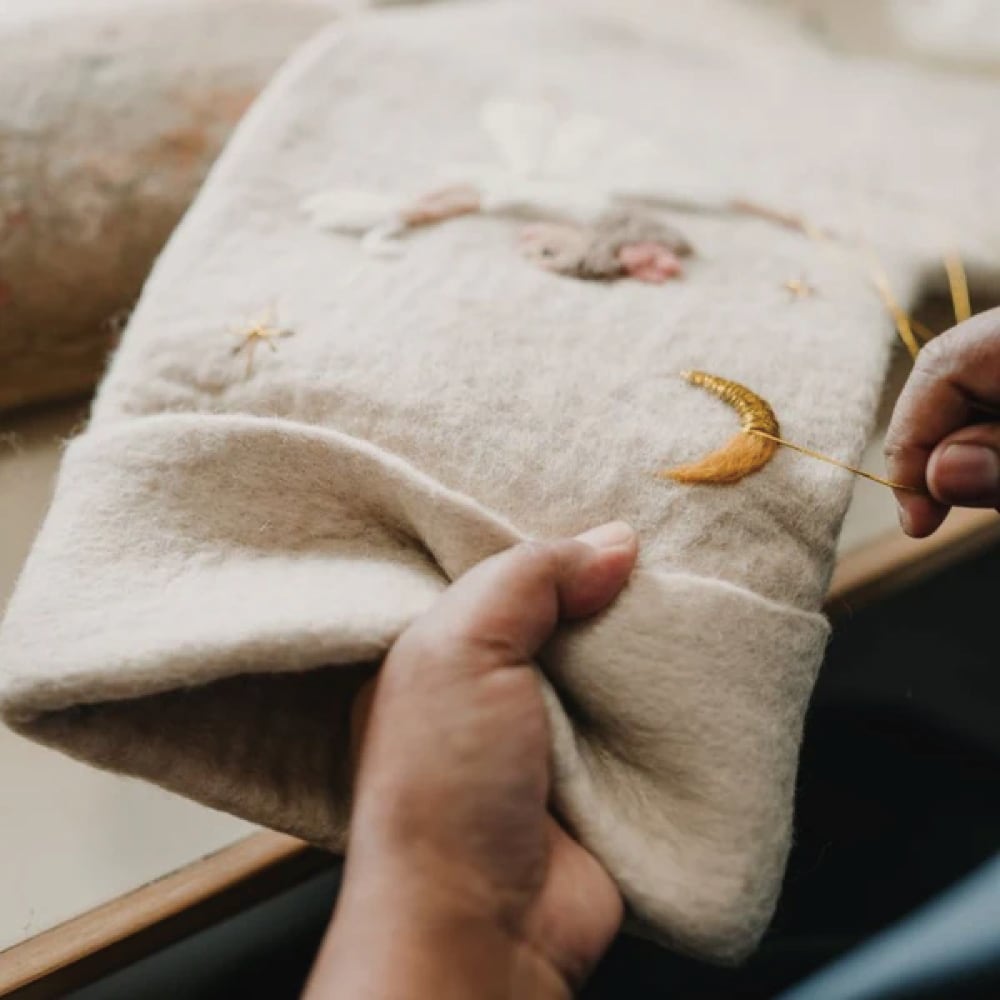 職人が一つひとつ丁寧に手作りし、刺繍やパンチニードルの細部までこだわりが感じられる特別な一品。