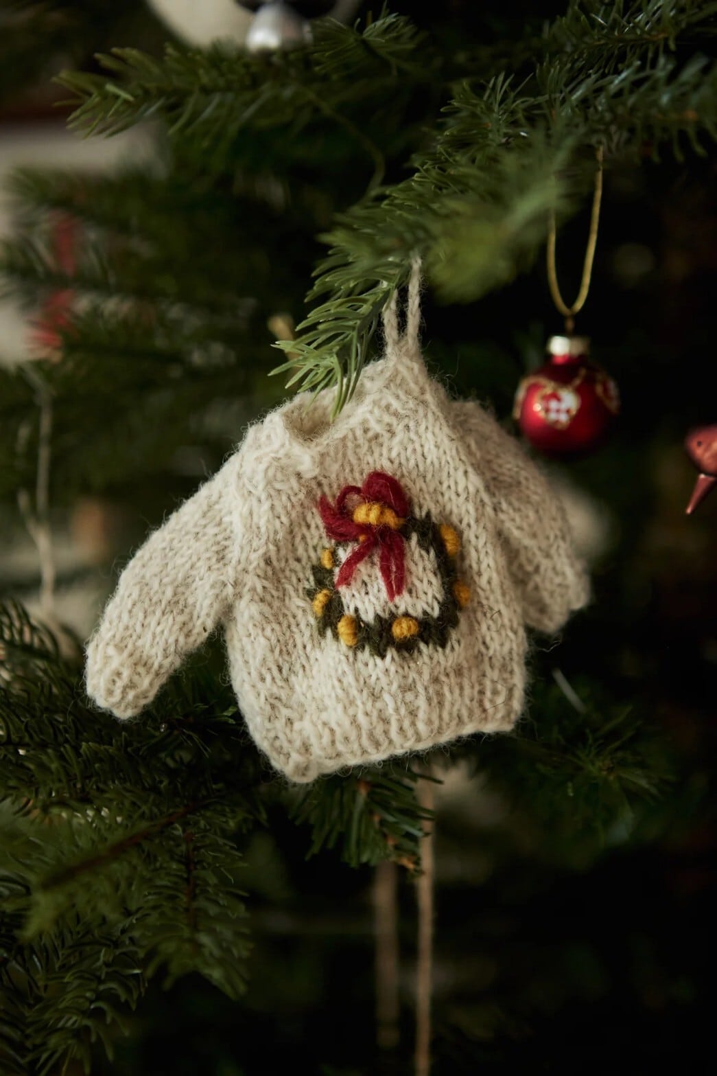 刺繍のリースが優しく華やかなアクセント。手編みのぬくもりが伝わるセーター型のオーナメントです。