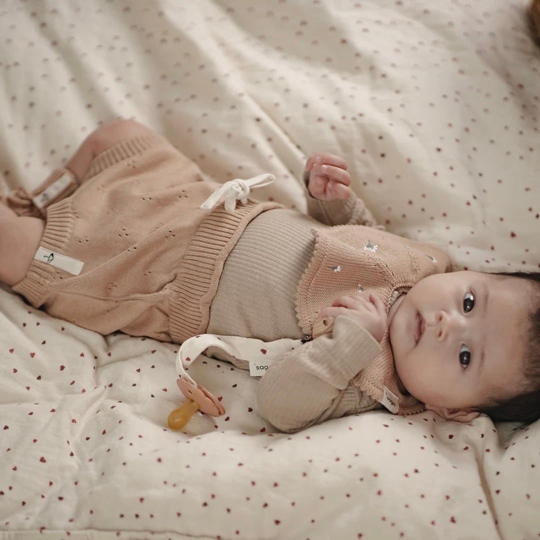 オーガニックコットン100%素材で作られた、赤ちゃんの肌にやさしいニットスタイ。
