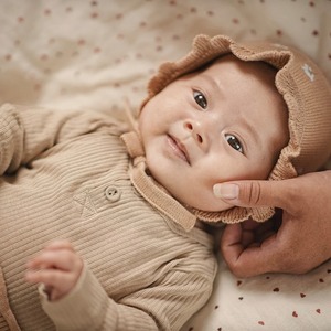 内側はやわらかなコットンで裏地をほどこし、赤ちゃんの頭をやさしく守りながらあたたかく包み込みます。