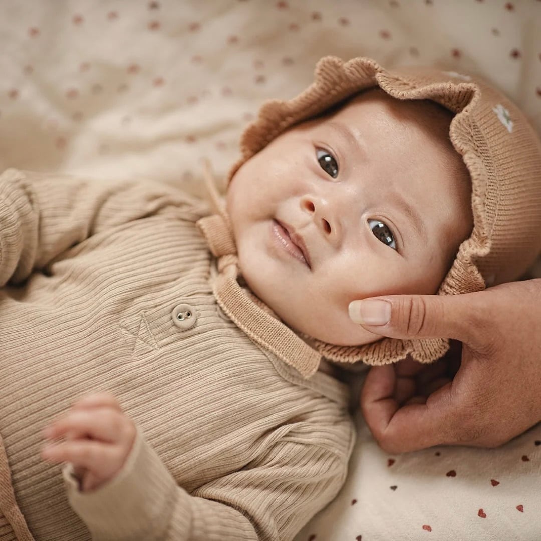 オーガニックコットン100%素材で作られた、赤ちゃんの肌にやさしいニット帽。