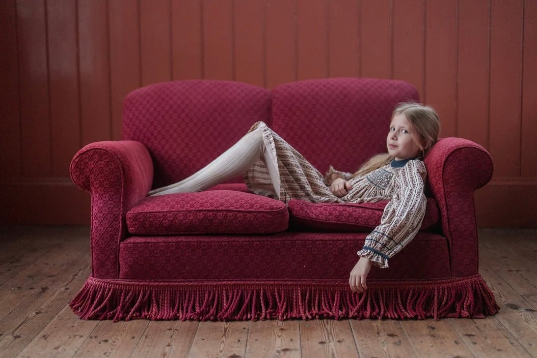 ラッフルカフス、コットントリムステッチのベルベットピーターパンカラー、袖と裾には2列のベルベットリボンがあしらわれています。