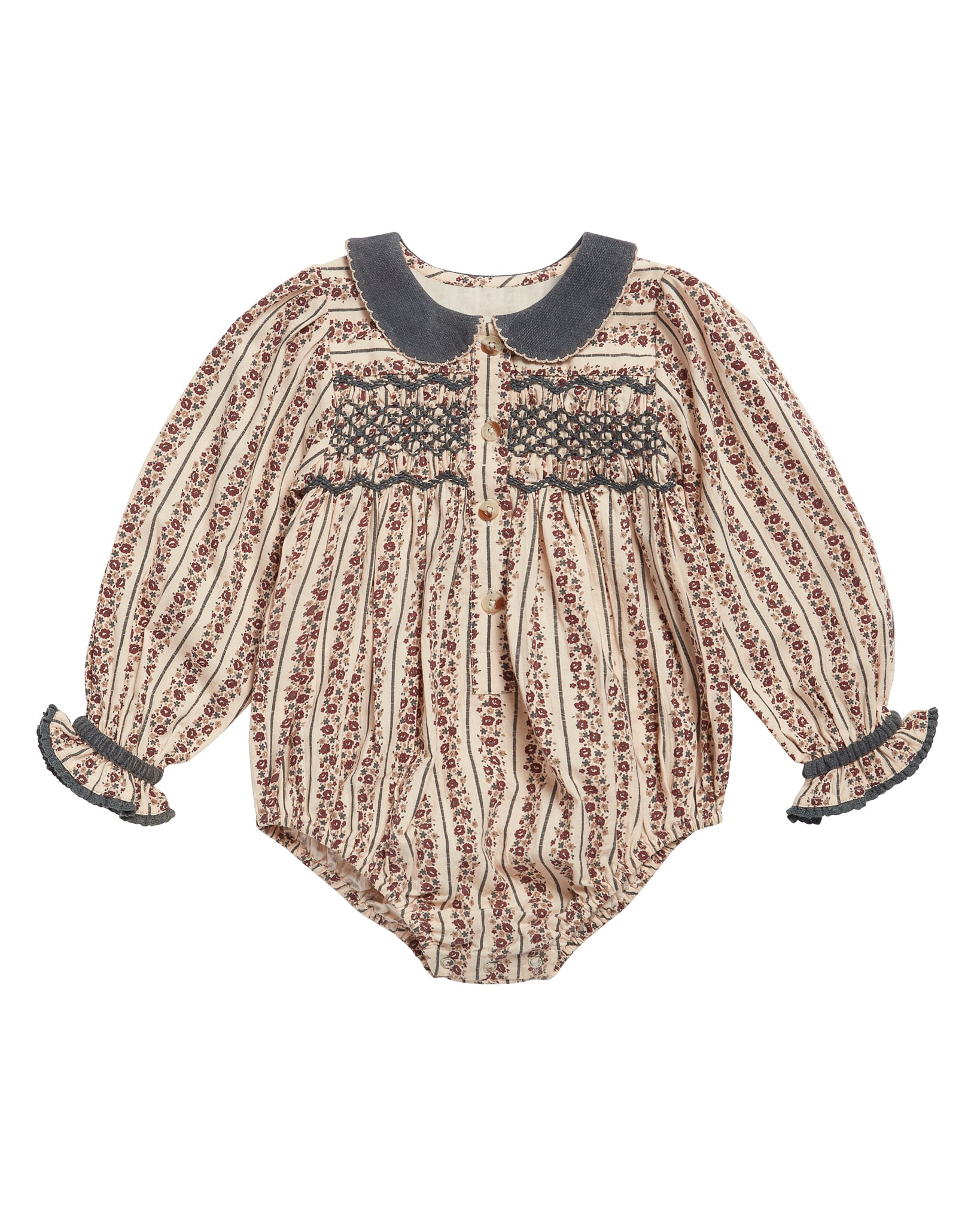 オーガニックのマロリーフローラルプリント生地で仕立てられた、クラシックでかわいらしいロンパース。