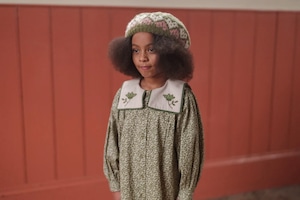 コントラストの効いたセーラーカラーにはフローラルアップリケとギャザークロッシェトリムをあしらい、肩にはタック、袖口は小さなボタンカフスがついています。