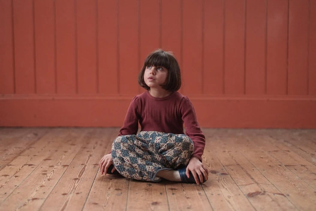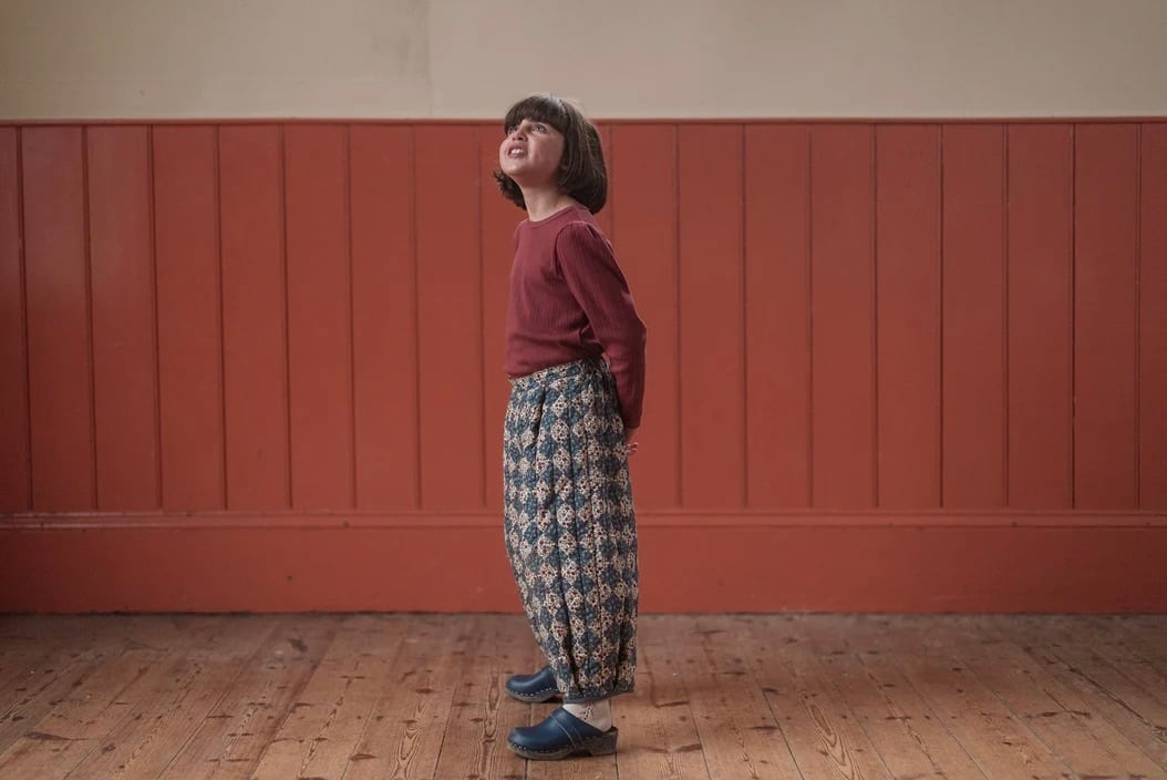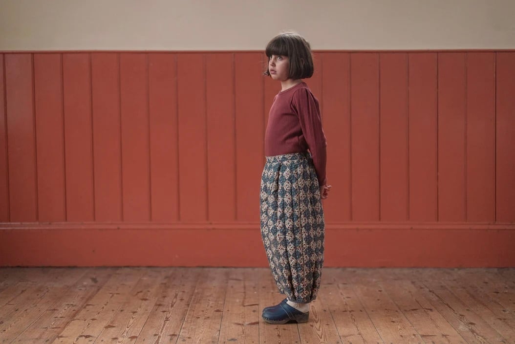 ハーレクインの花柄生地を使ったキルティングパンツ。綿入りでふんわり仕立て、裏地にはオーガニックコットンを使用しています。