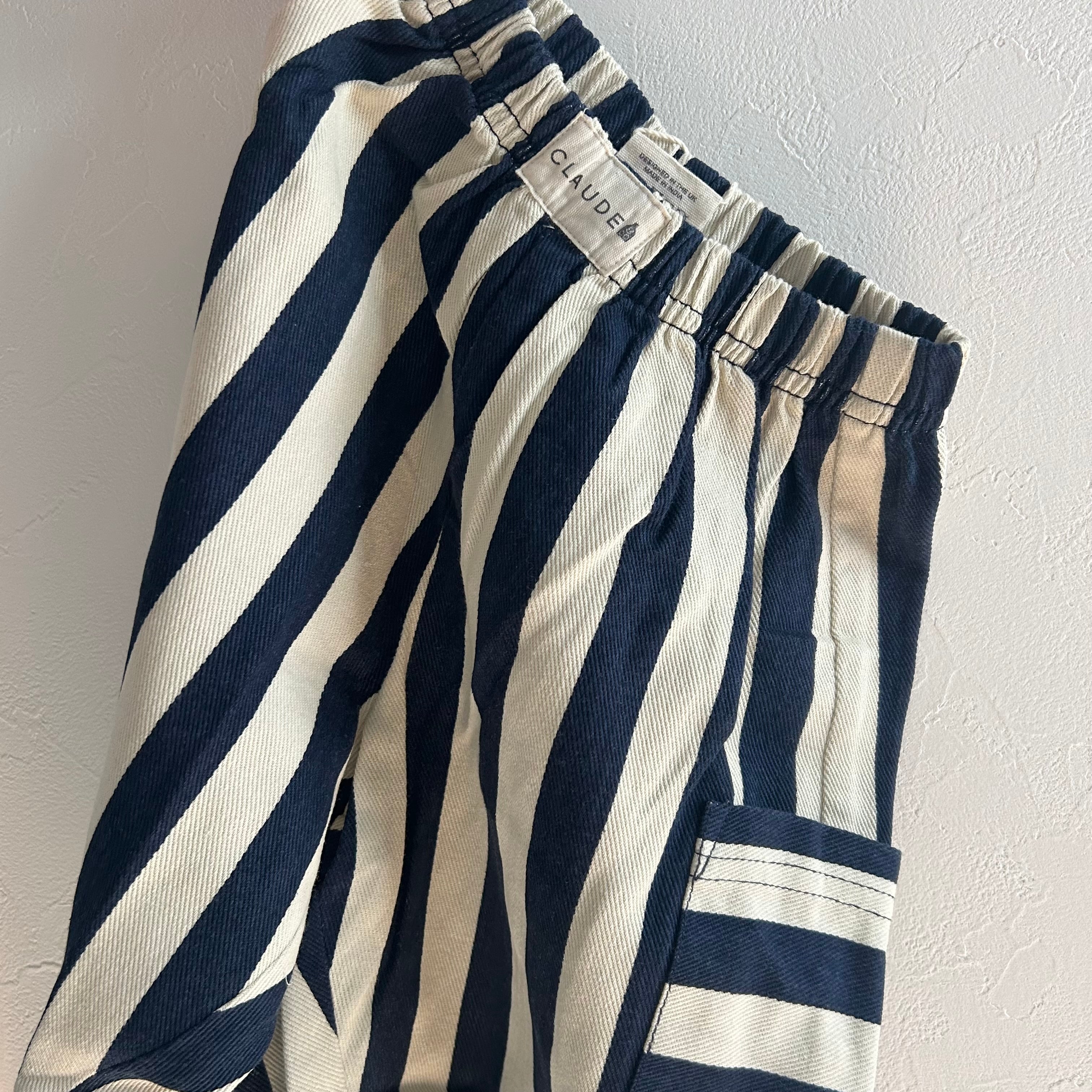 ミッドナイトネイビーのストライプ柄が可愛いユニセックスパンツです。