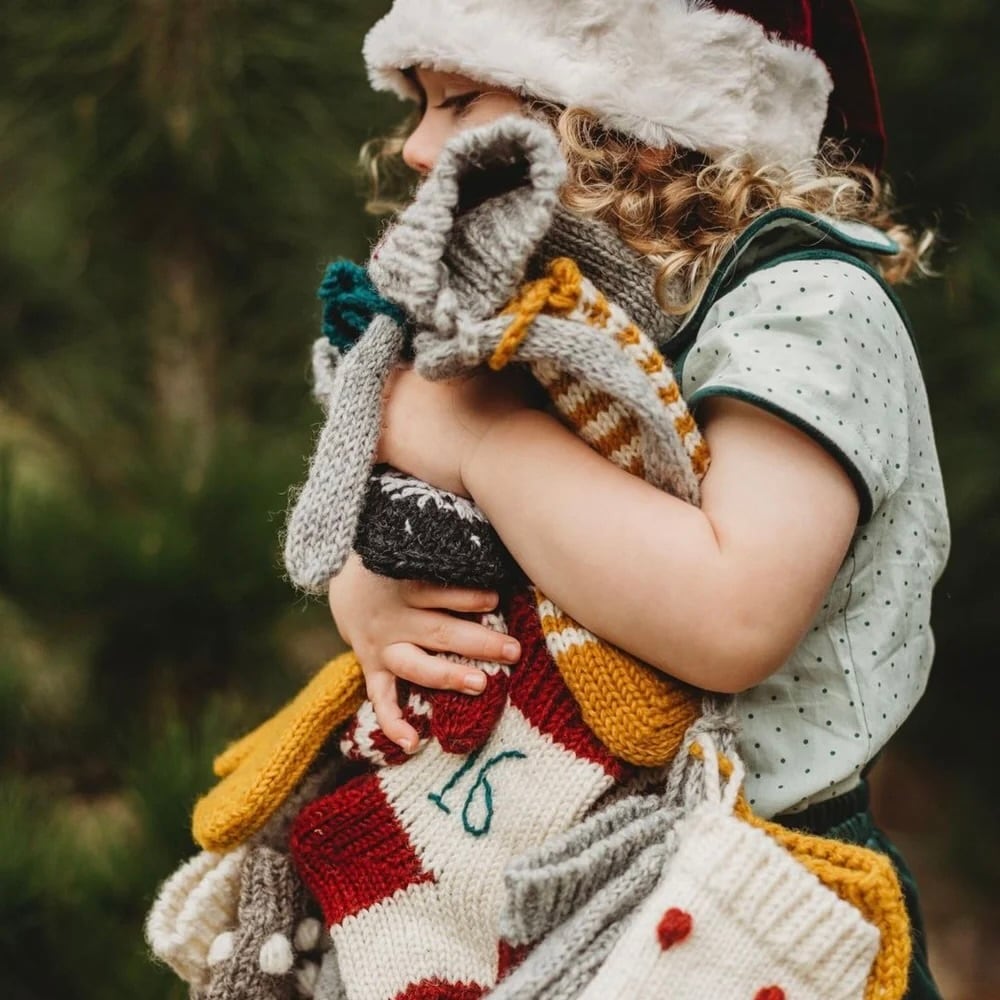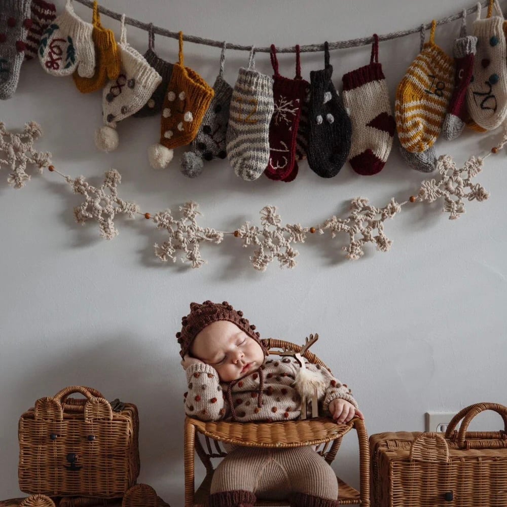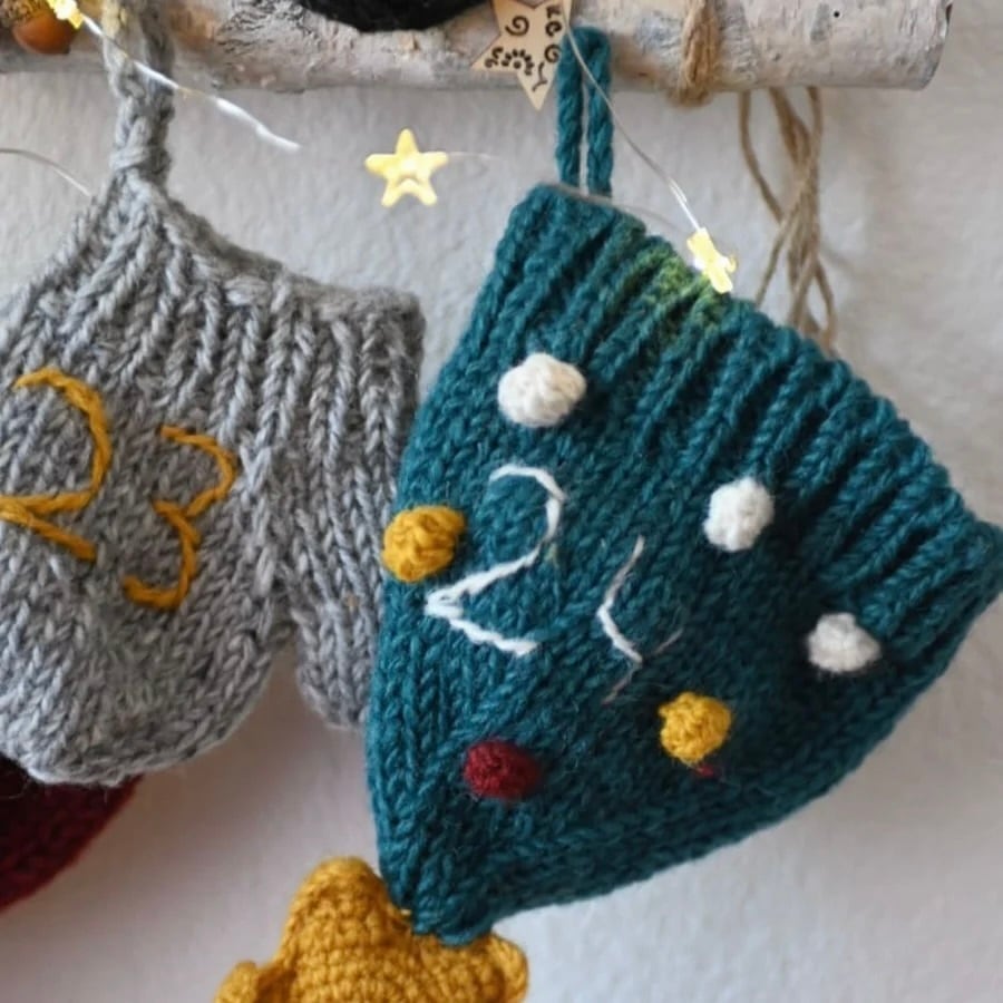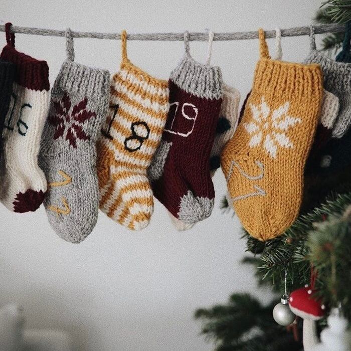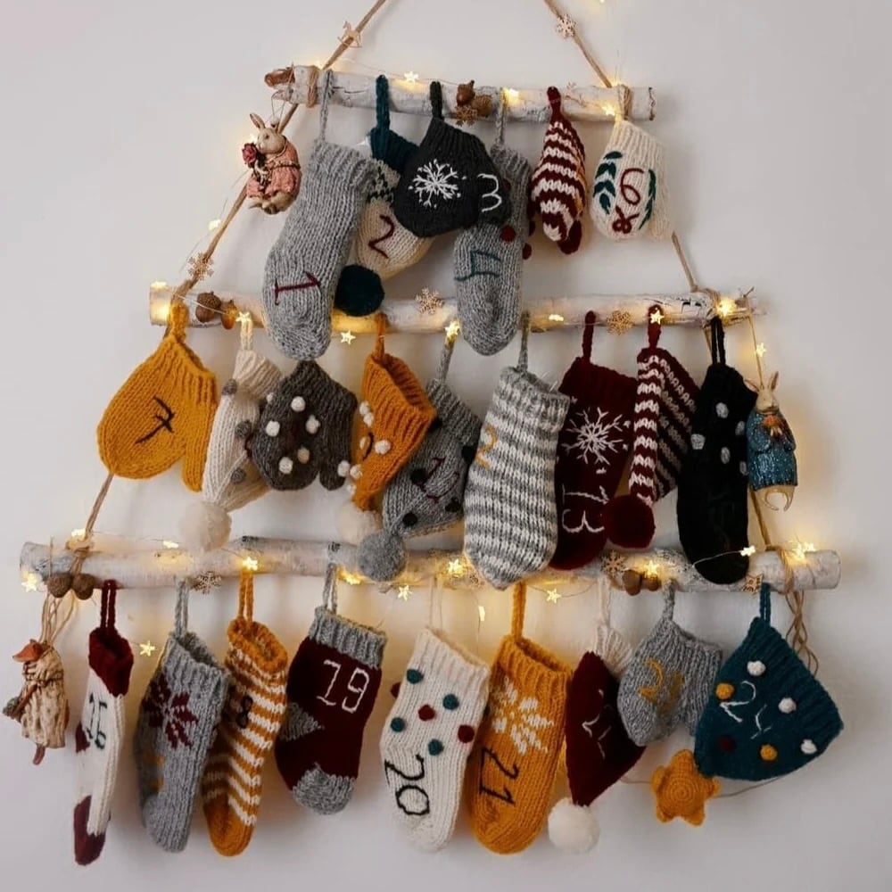 羊毛を使い、バブル編みなど様々な技法でひとつひとつ丁寧に手作りされた24個のミトン・帽子・靴下には、手刺繍で番号が入っています。