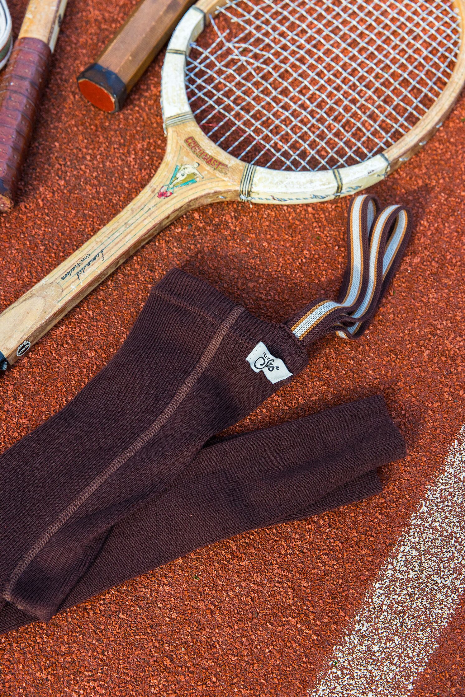 リッチなチョコレートブラウンに、クリーム×アンバーのレトロストライプ肩ひもを合わせた、ちょっぴり nostalgic な一枚。落ち着いた色味だけど、スポーティーな可愛さもあるデザインです。