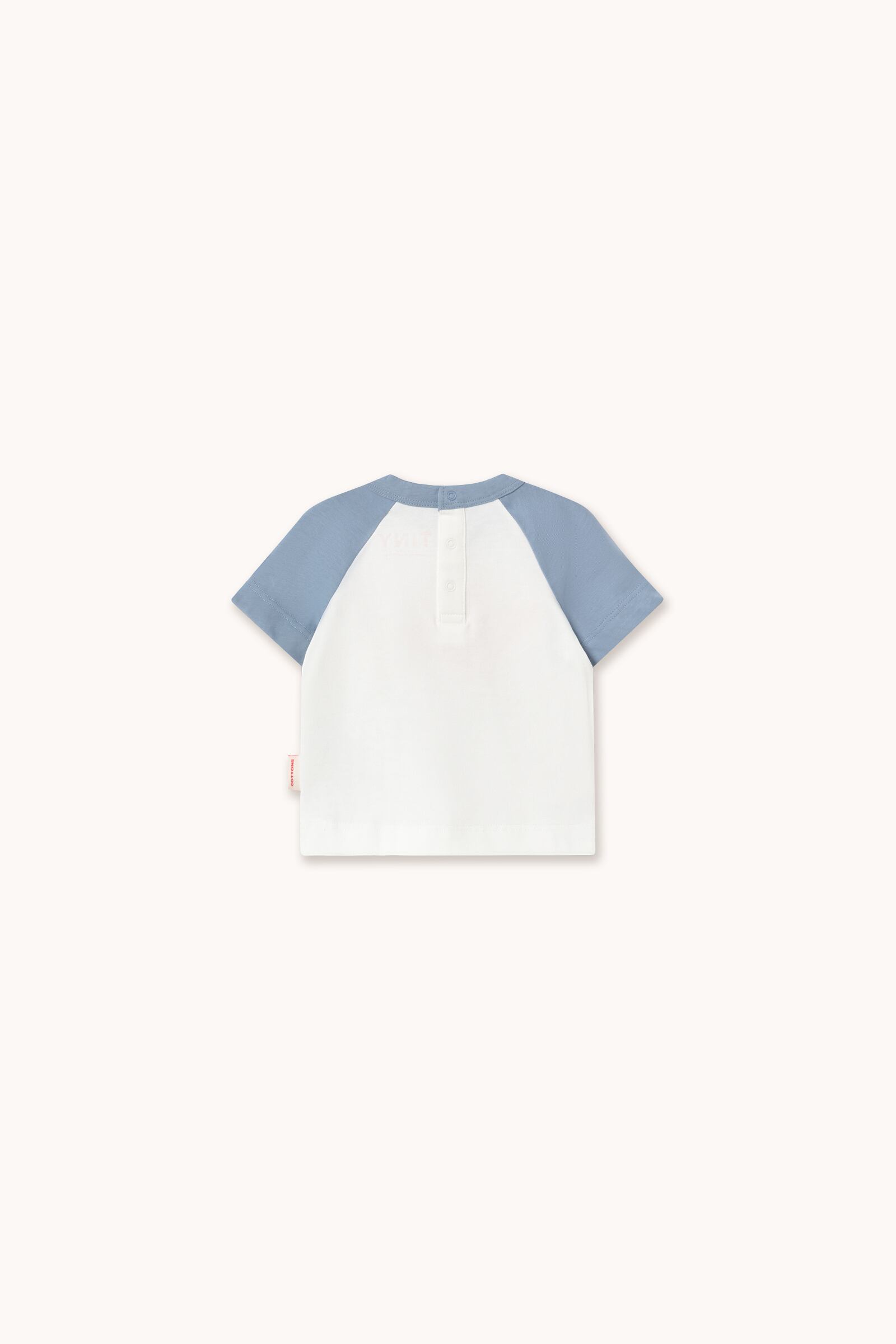身頃はホワイト、袖はくすんだブルーの配色で、やさしいコントラストがtinycottonsらしい一枚です。