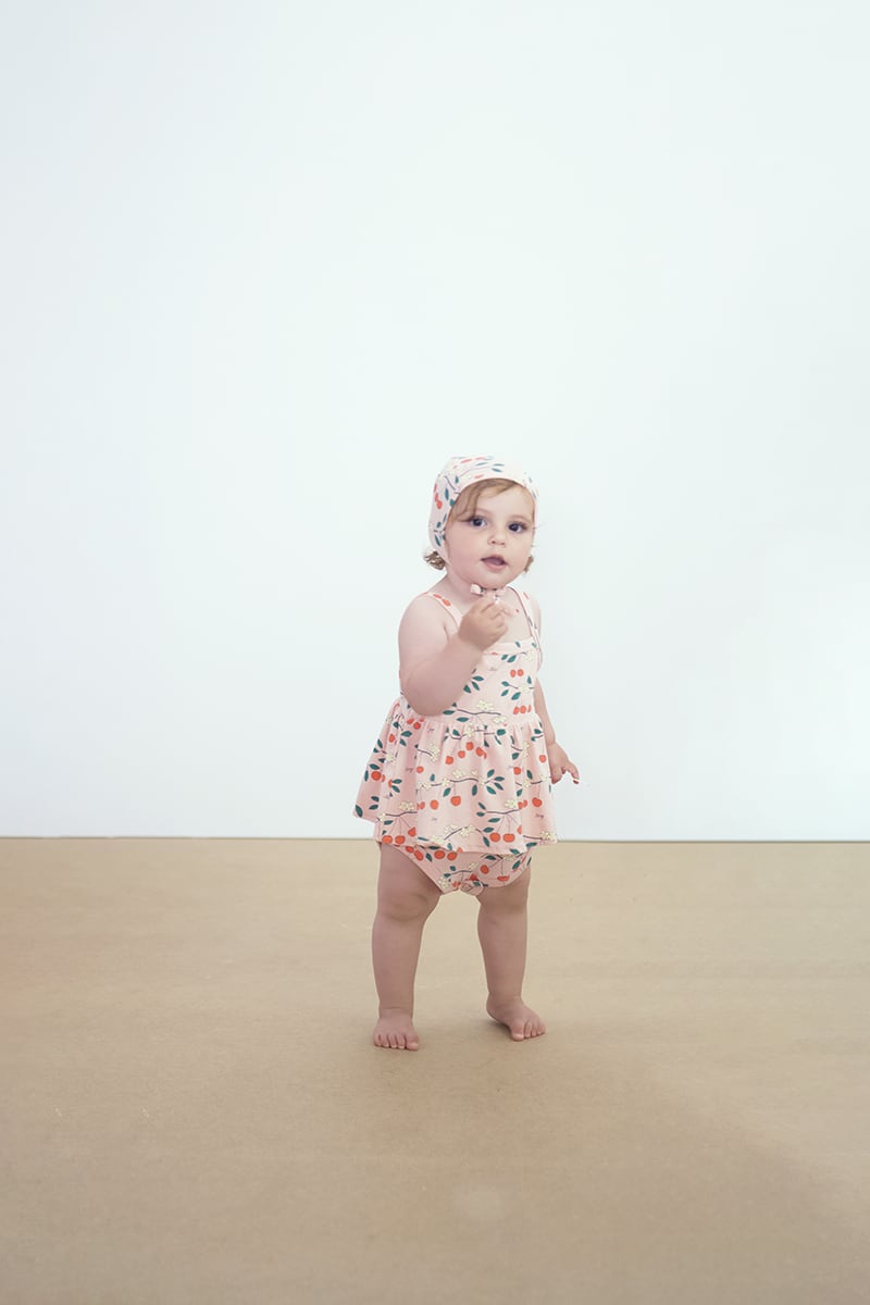 落ち着いたピンクをベースに、さくらんぼと小さなお花を散りばめたロンパース。