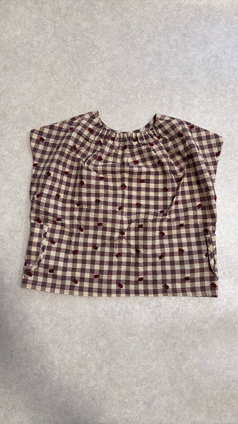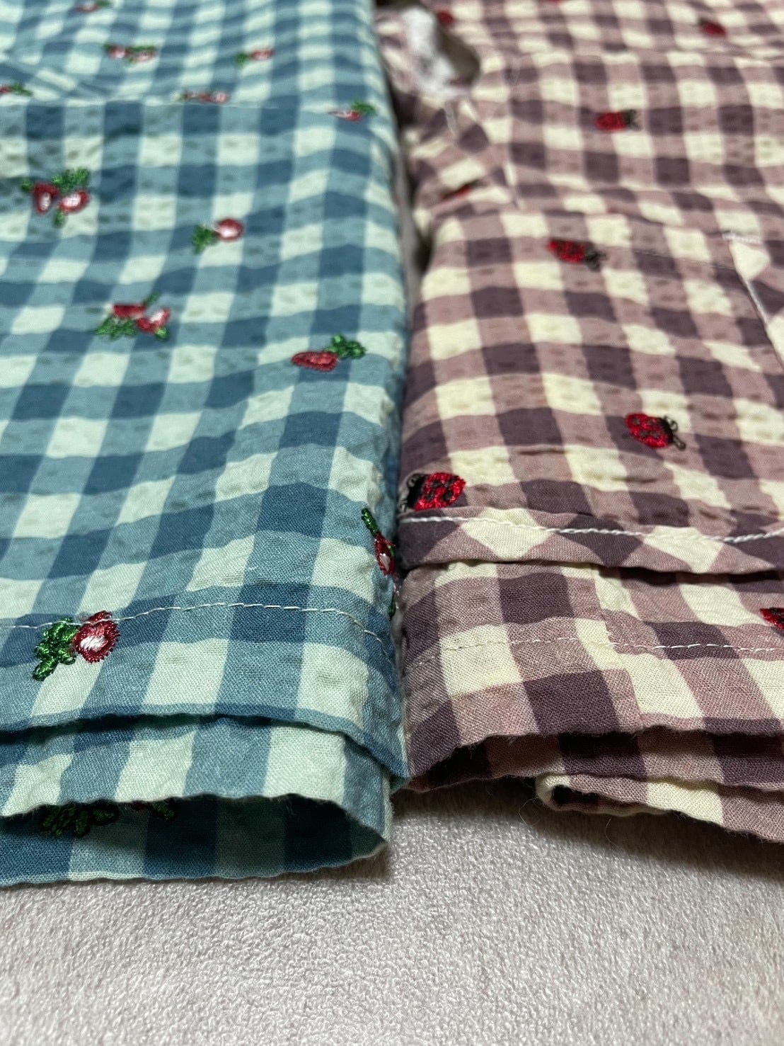 ギンガムチェックのシアーサッカー生地に刺繍を施したシリーズ。