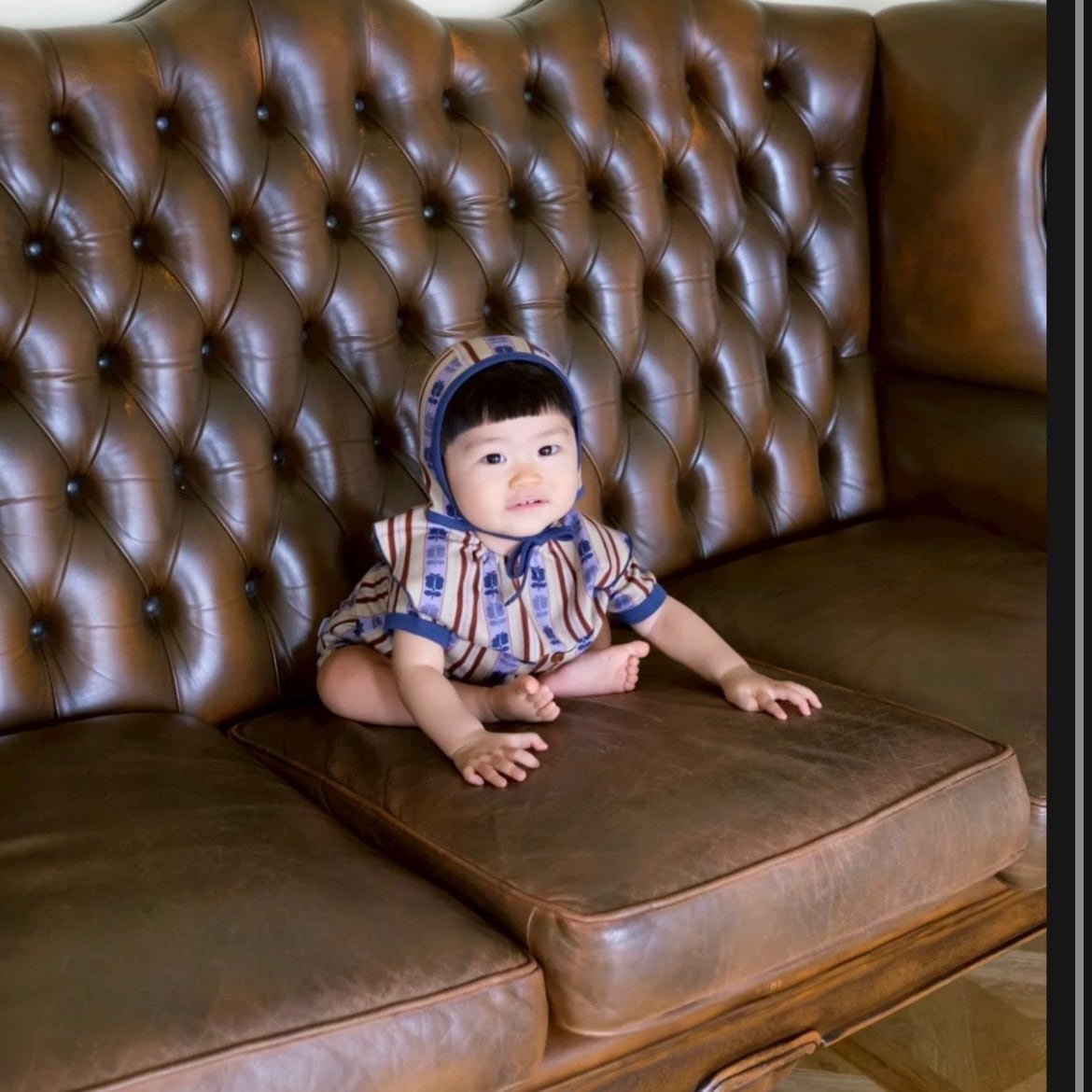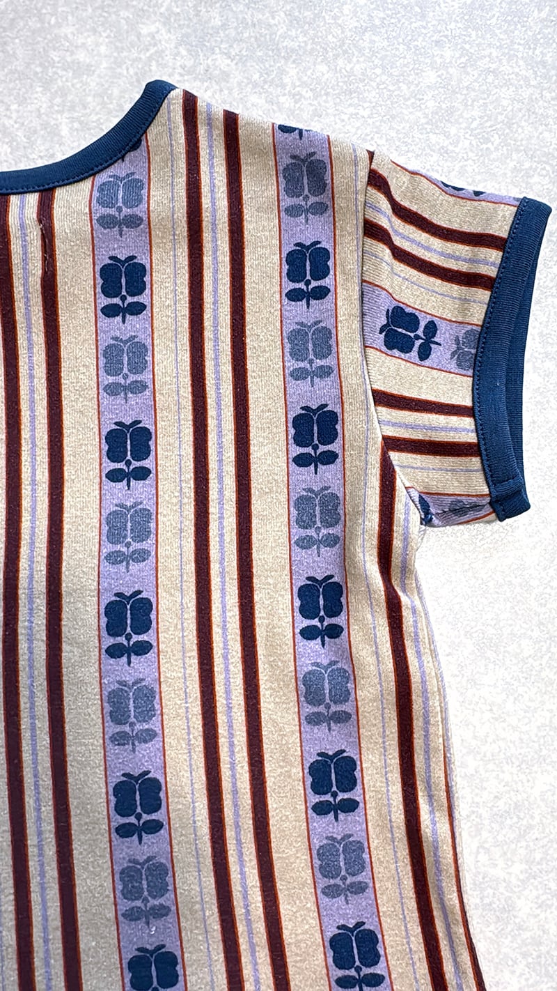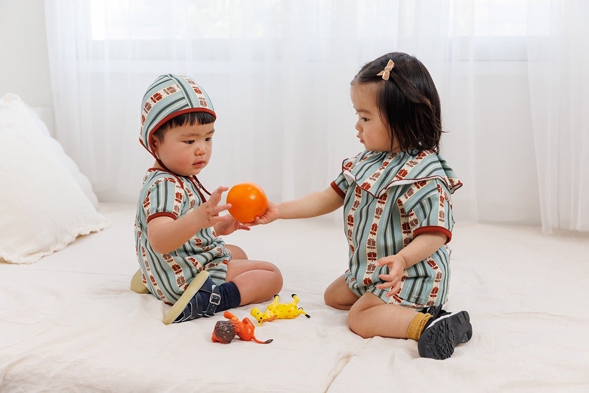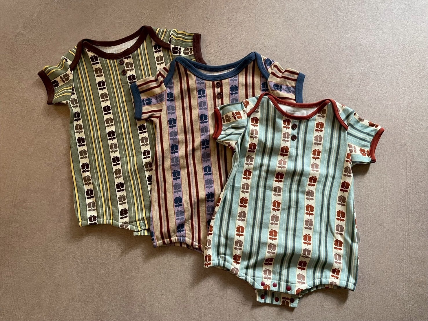 アンティークの帯からヒントを得た、レトロストライプシリーズのベビーロンパースです。