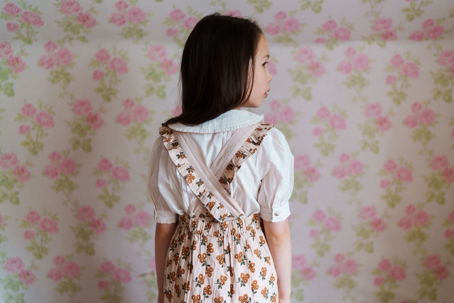丸くふんわり広がった襟にコットンのギャザーがあしらわれたデザインがアクセントになっています。