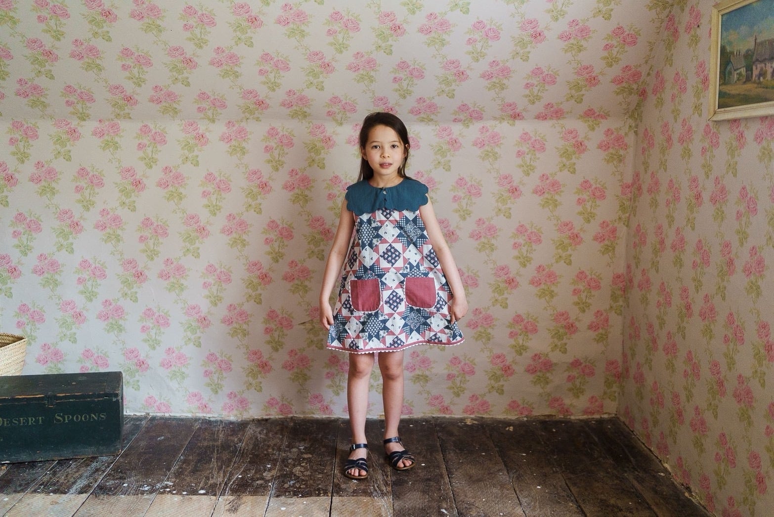 どんなコーディネートにも合わせやすい、かわいいセーラーカラーです。特にパッチワークのAライン「Hannah Dress」との相性が抜群。首元はボタンで留められます。