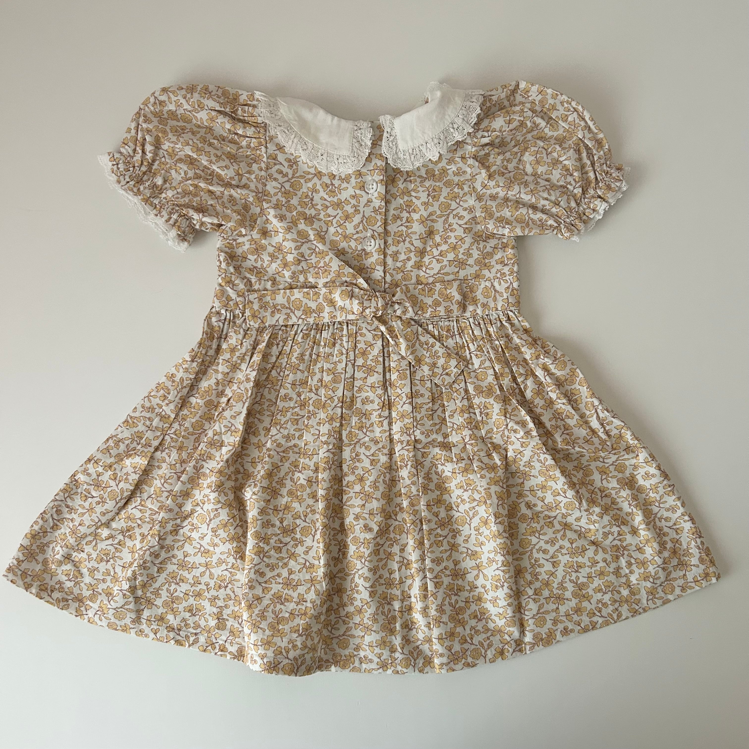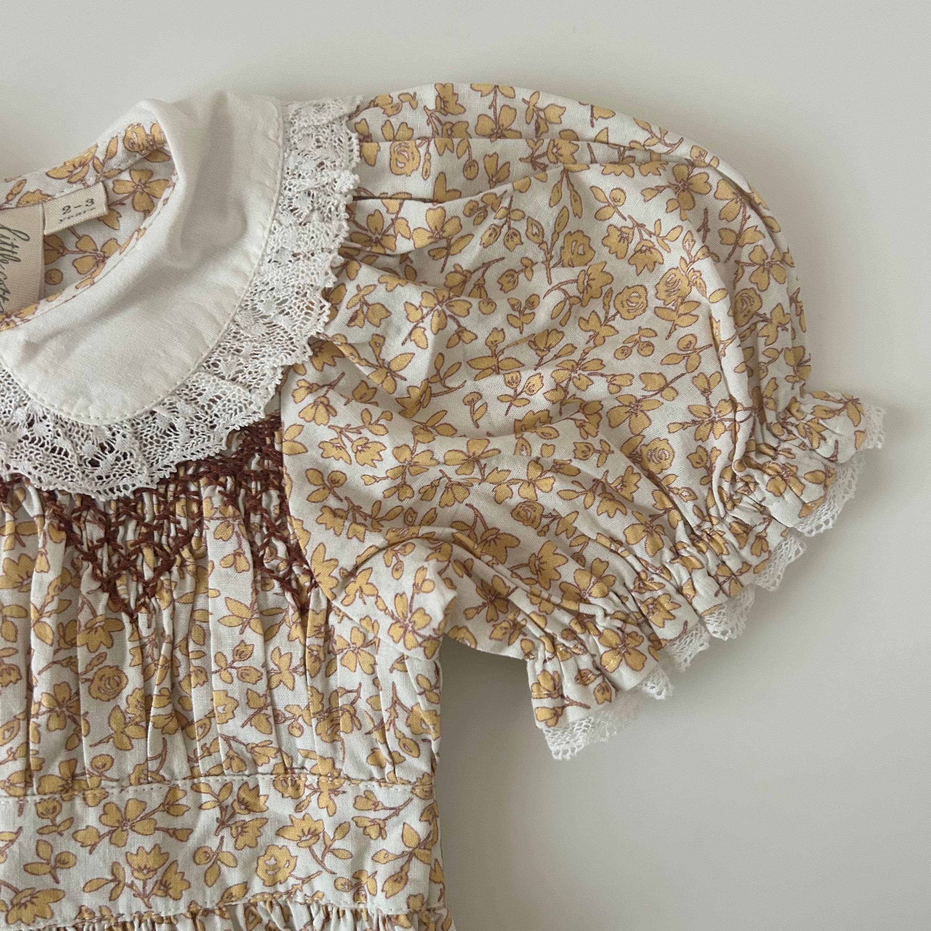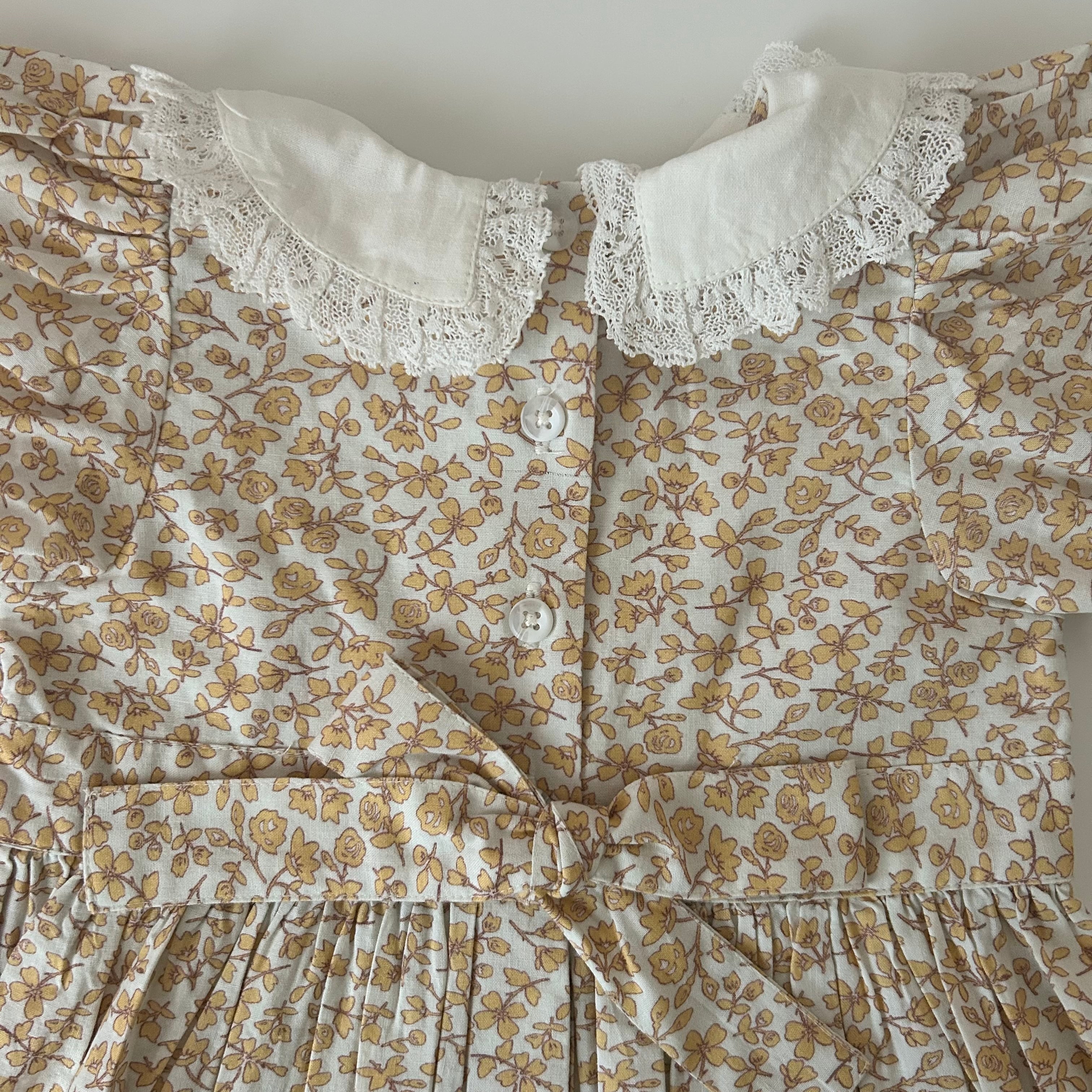 ギャザーが入った身頃には手作業のスモッキング刺繍が施され、ふんわりパフスリーブはゴム入りで着やすく、コットンレースのギャザー付きペタルカラーがアクセントになっています。動きやすいフルスカートで、着心地もスタイルも両立。