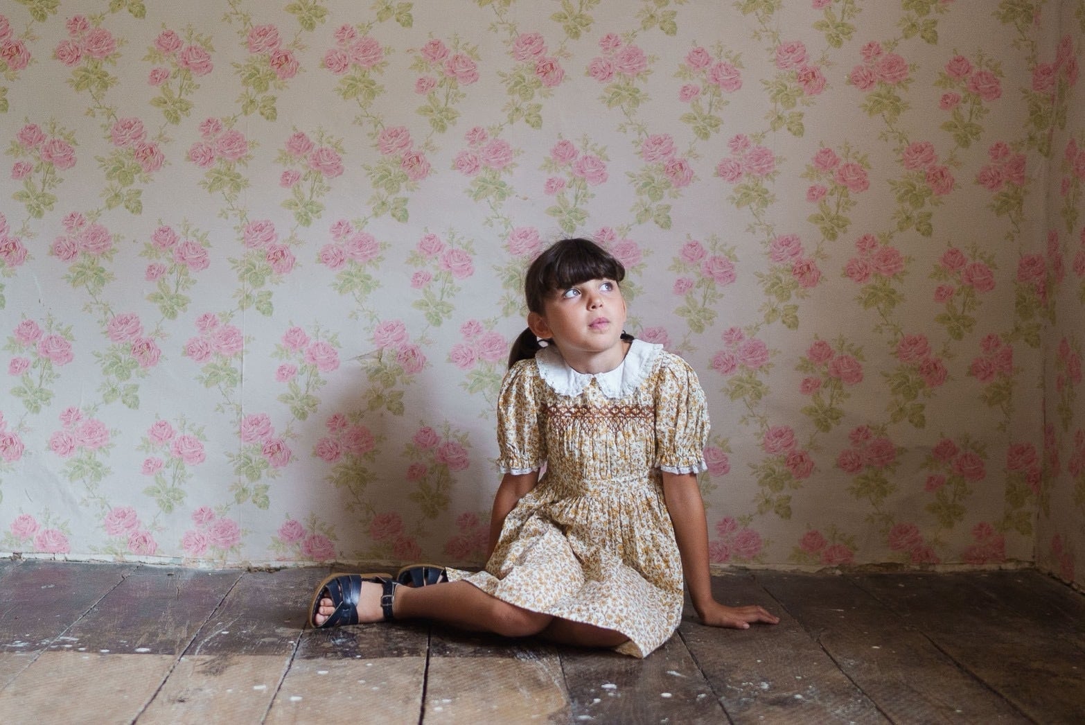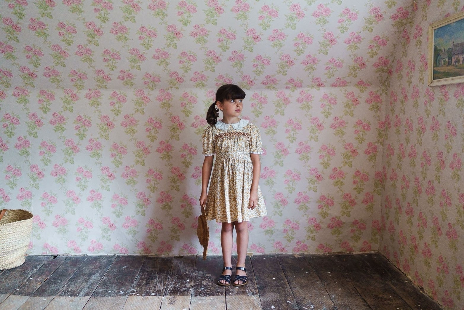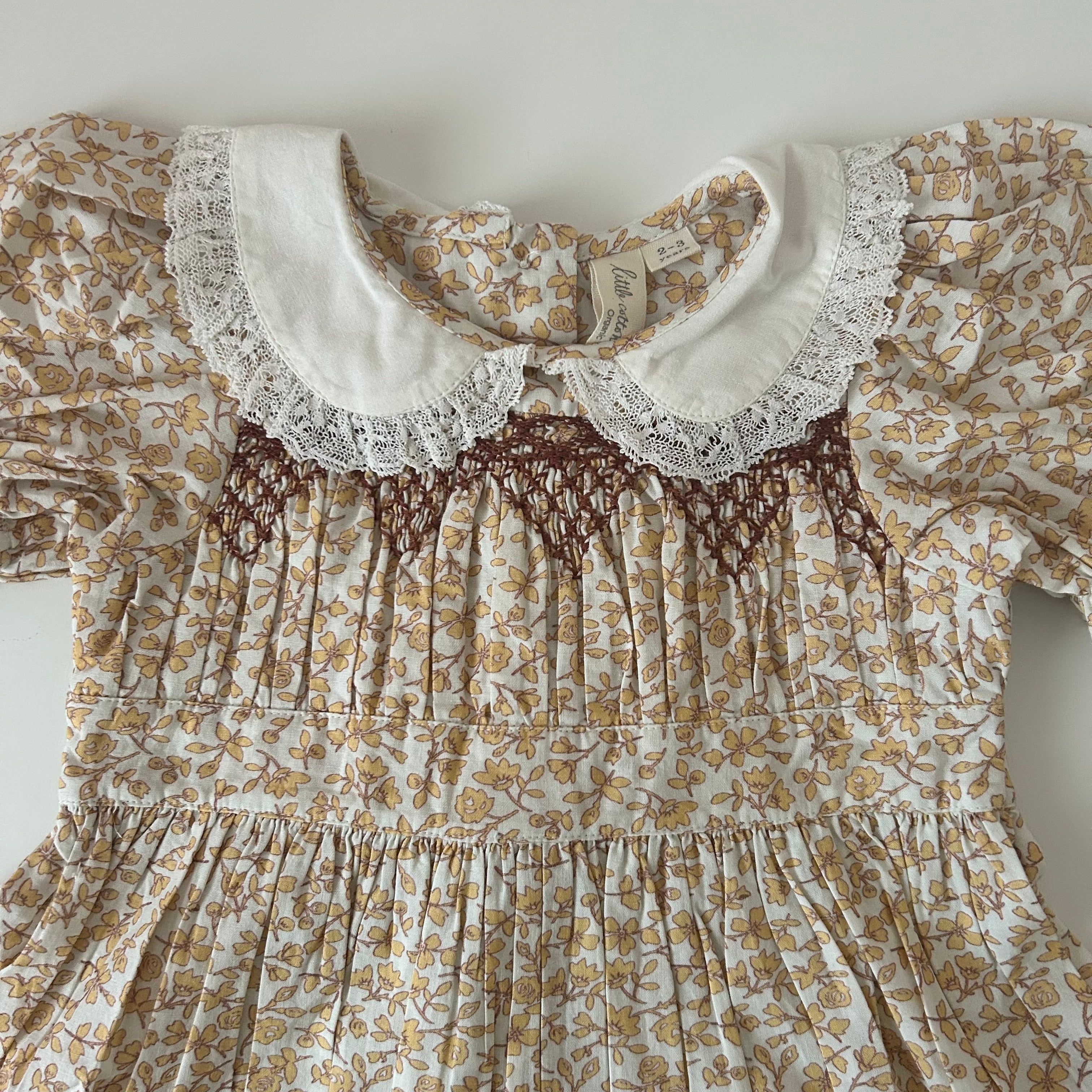 ギャザーが入った身頃には手作業のスモッキング刺繍が施され、ふんわりパフスリーブはゴム入りで着やすく、コットンレースのギャザー付きペタルカラーがアクセントになっています。動きやすいフルスカートで、着心地もスタイルも両立。