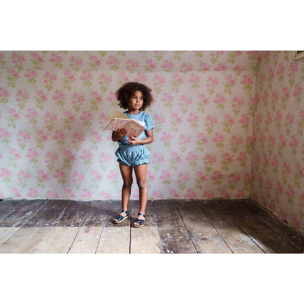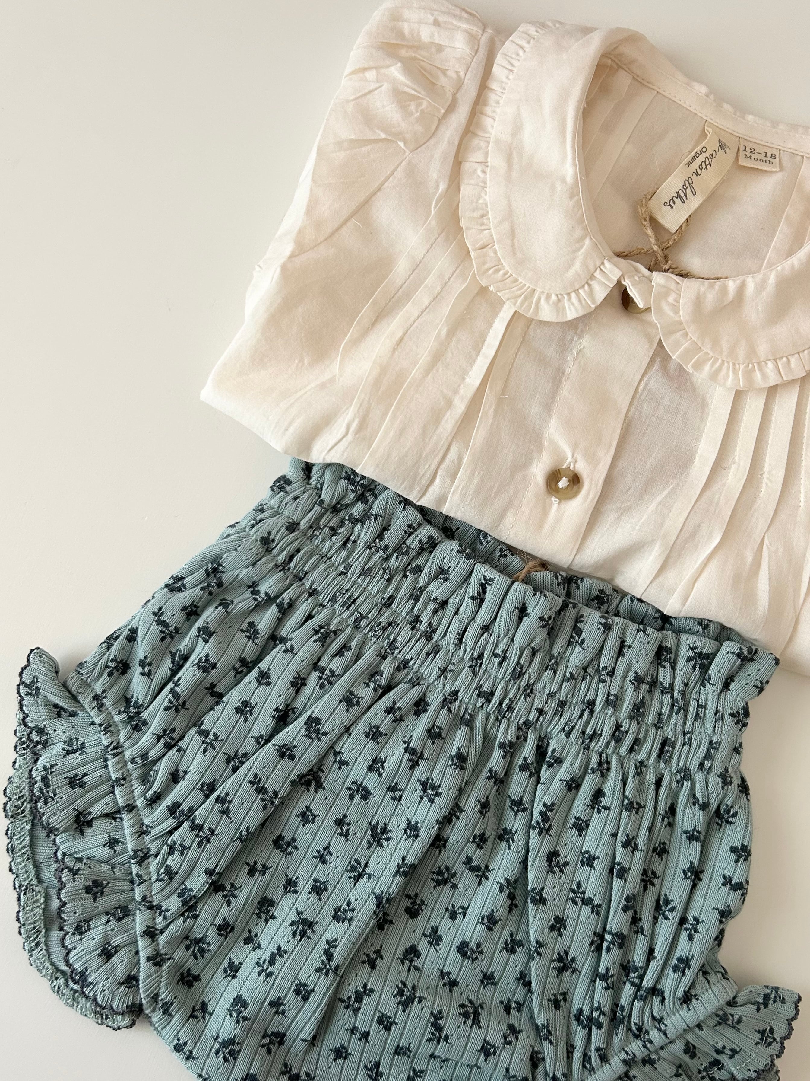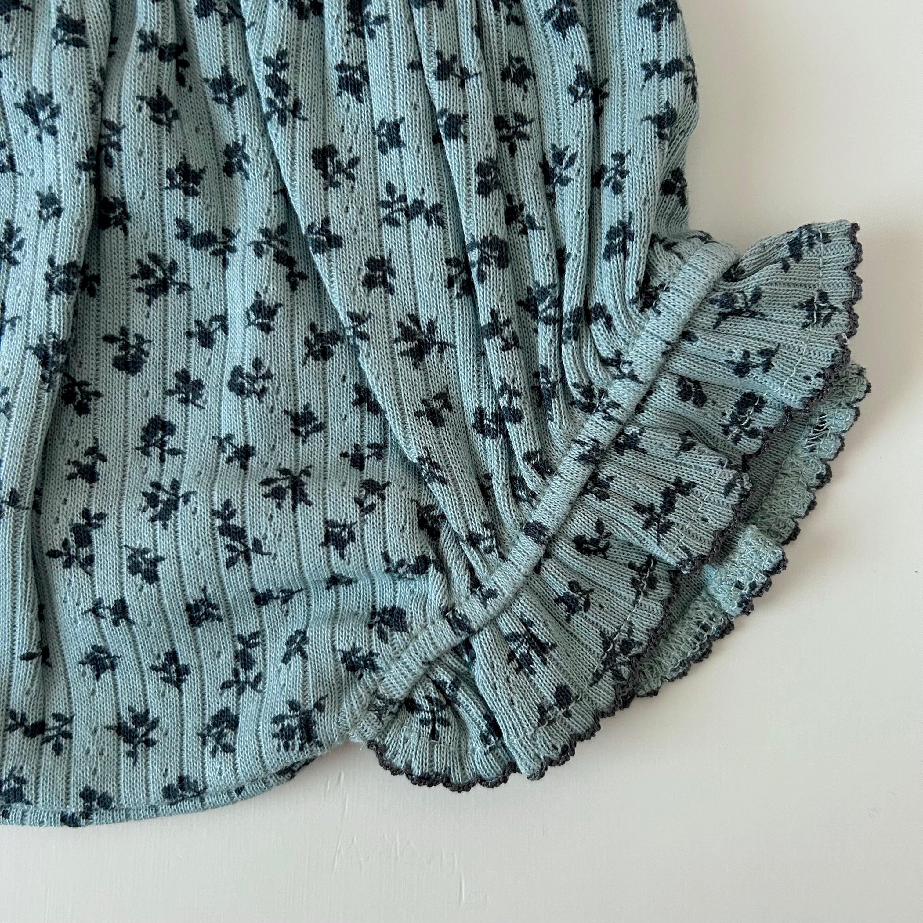 落ち着いたブルーの小花柄オーガニックコットンで作られた、かわいくて履き心地の良いブルマです。