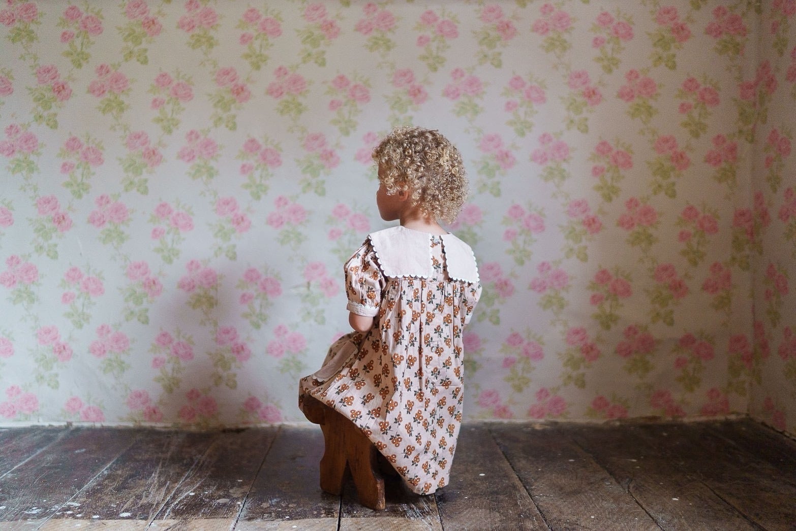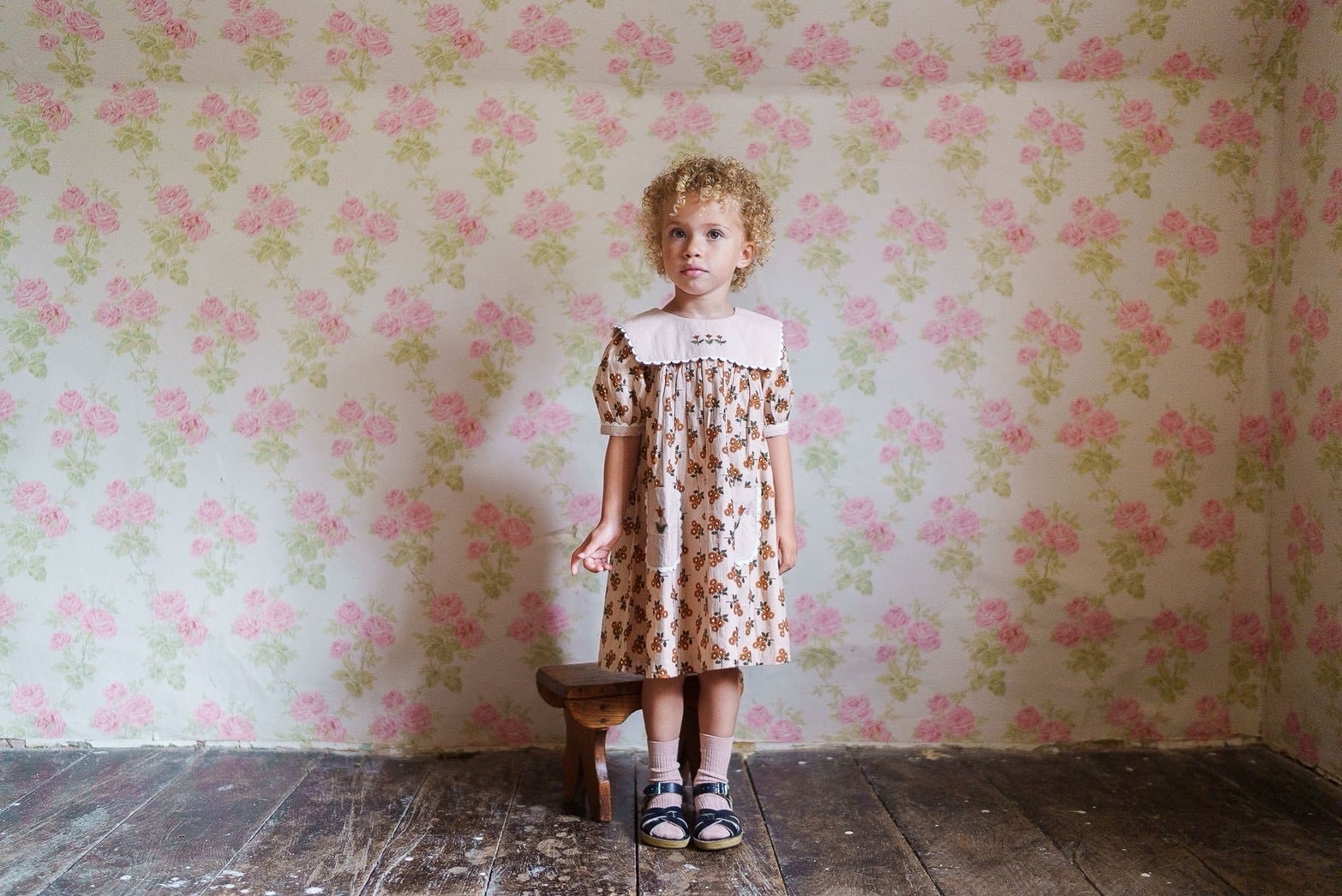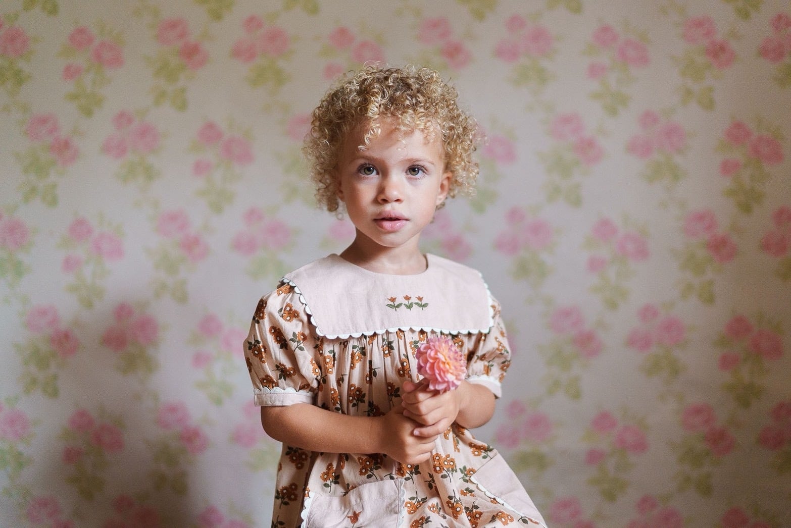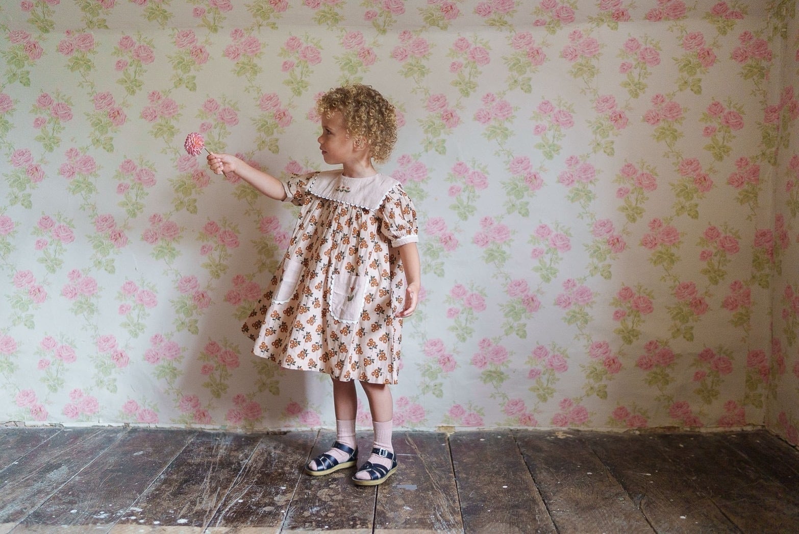 やさしいマリーゴールド柄のオーガニックコットンで作られた、ヴィンテージ感のあるかわいいワンピースです。