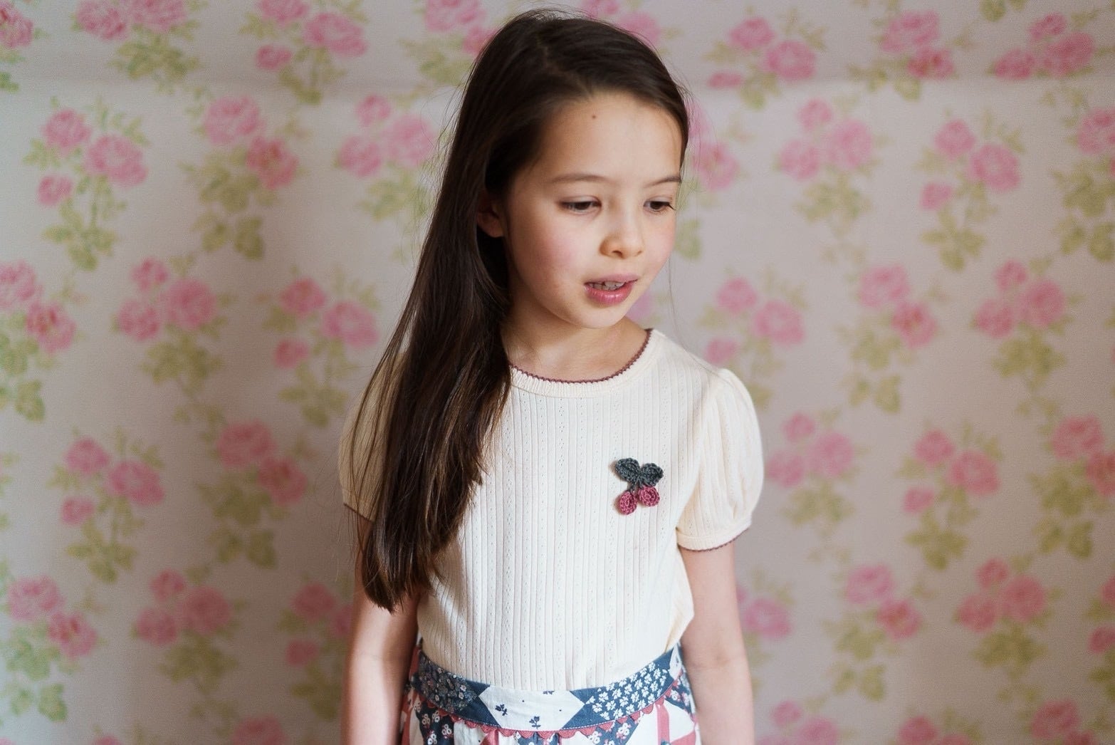 胸元には手編みのさくらんぼモチーフがあしらわれています。