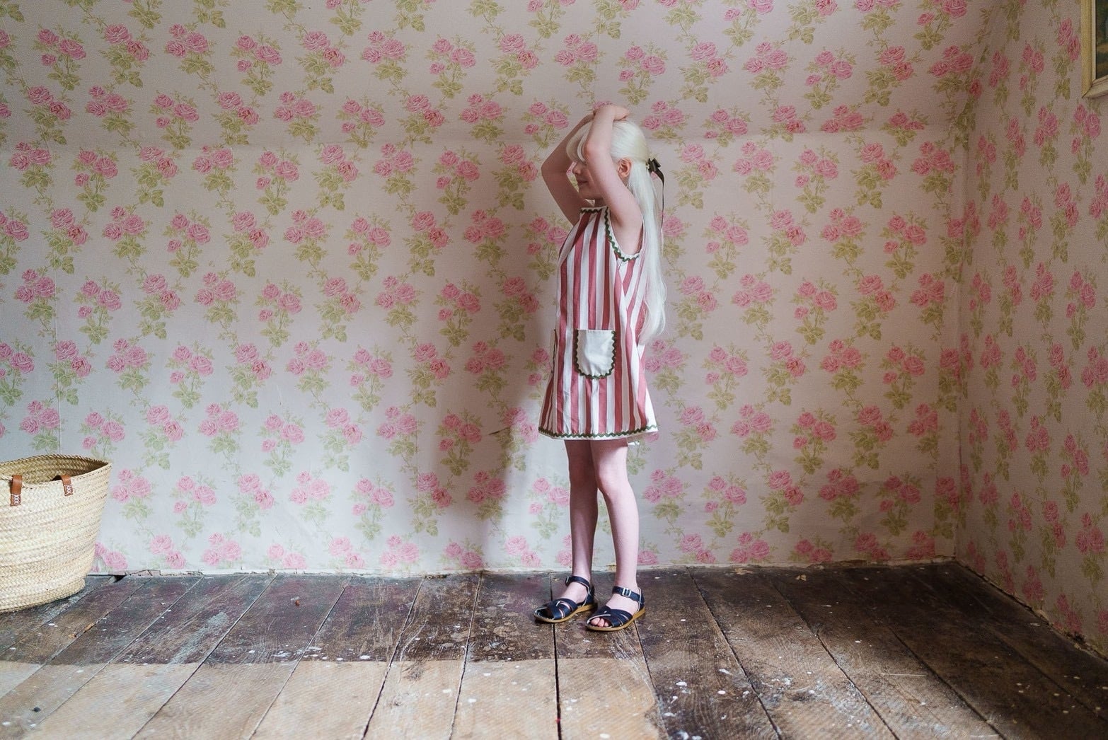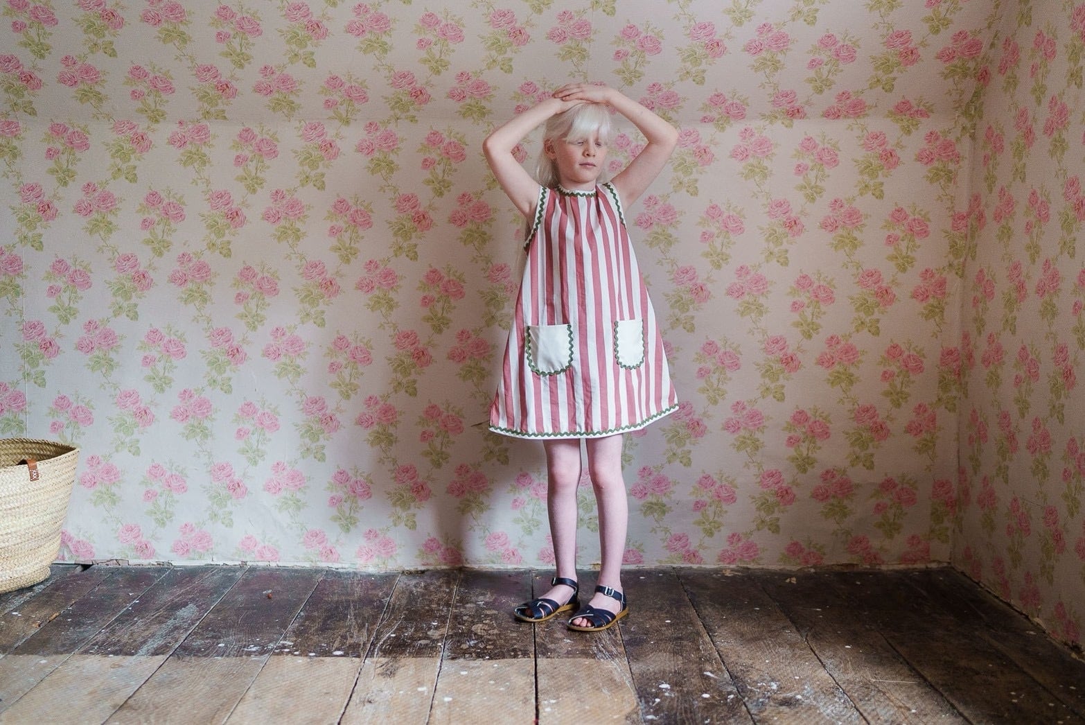 ラズベリーストライプのコットンで作られた、かわいくて着心地の良いワンピースです。ピナフォアとしても、1枚で着てもOK。