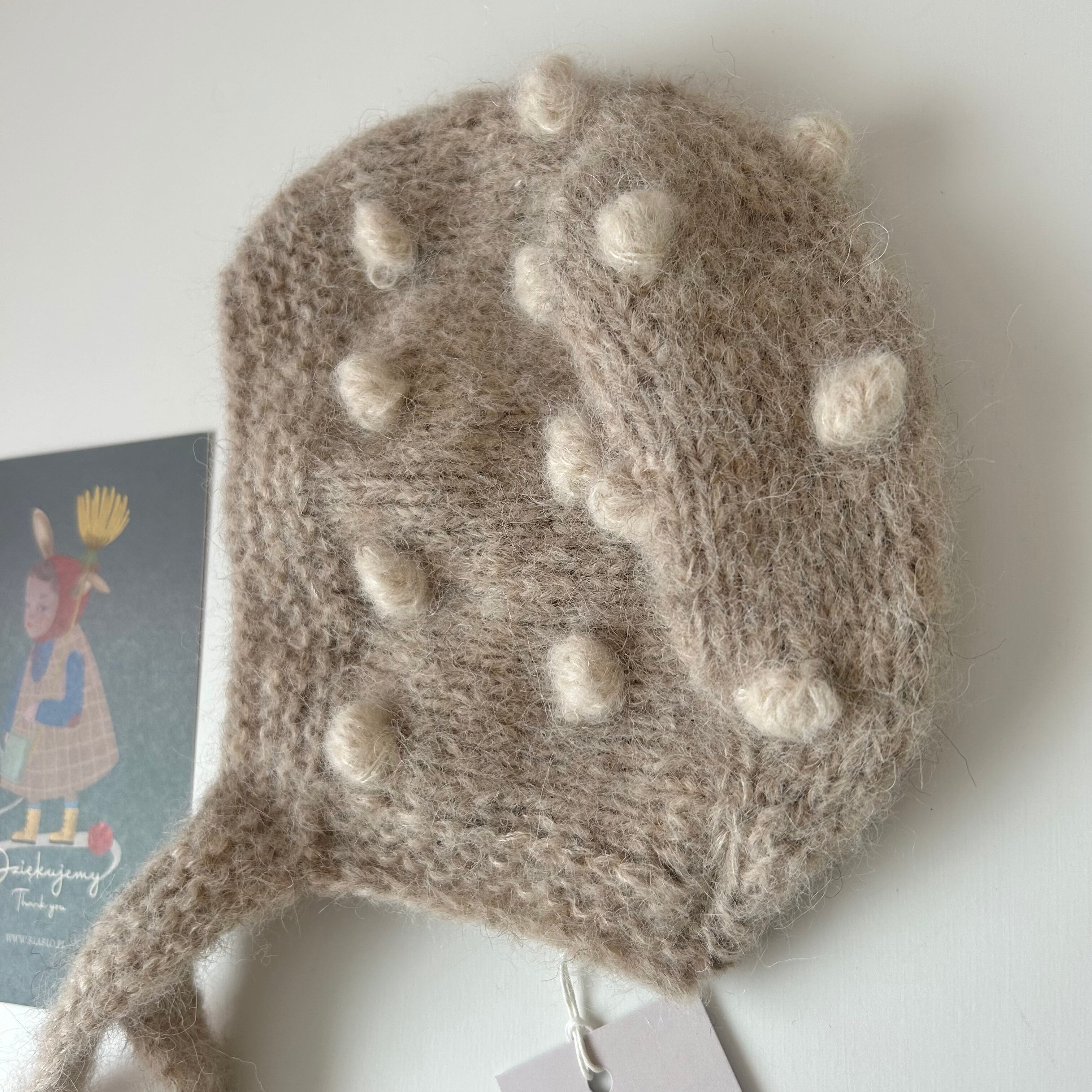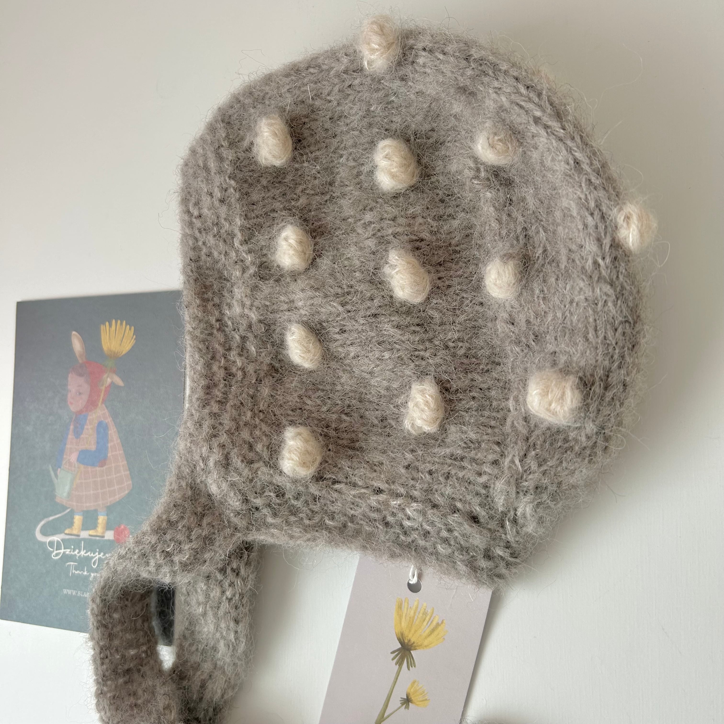 アルパカとシルクの毛糸で編まれたボンネットです。